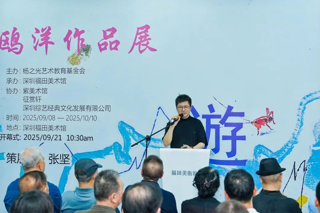 深圳市美术家协会副主席、福田区美术家协会主席、福田美术馆馆长张闯代表福田美术馆祝贺展览开幕。他谈到,20世纪80年代从老师口中首次知晓鸥洋名字,后续对其《雏鹰展翅》《不灭的明灯》等早年作品印象深刻,并表示鸥洋的作品将美学思想与中国东方美学思想融合,作品富有文人诗意,达到“画中有诗,诗中有画”的意境,在传统花鸟画与油画结合上有独特方法,代表时代前列,引领艺术家探索,兼具艺术传承与深厚文化底蕴。