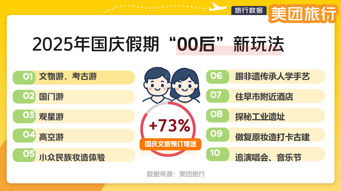 超长假期激发异地长线游、周边短途游、本地沉浸游多重玩法。据美团旅行国庆假期“00后”新玩法预测,文物游、国门游、观星游、高空游、小众民族妆造体验、跟非遗传承人学手艺、住早市附近酒店、探秘工业遗址、做复原妆造打卡古建、追演唱会与音乐节,将掀起假期旅游新潮流。