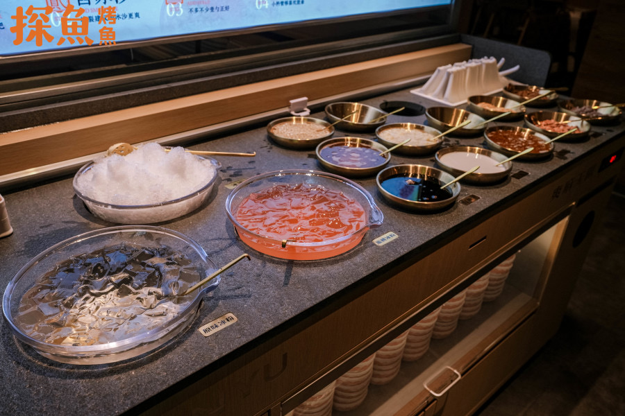 探鱼最具有特色的就是冰粉自助,自助台提供10余款精致小料,桂花蜜、桃胶、燕麦爆珠、山楂片、葡萄干等,消费者可随心搭配,创作专属自己的一碗臻品冰粉,让更多消费者喜爱探鱼。