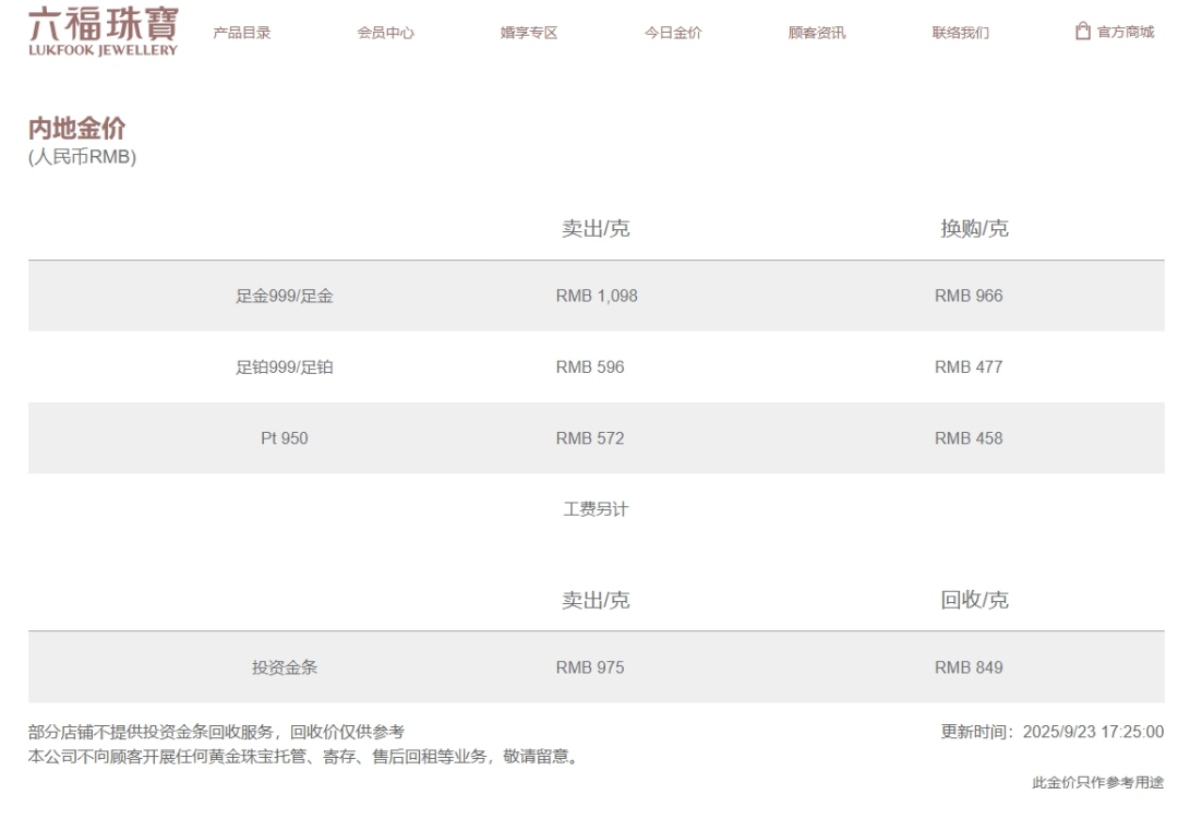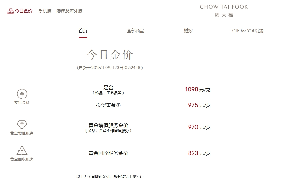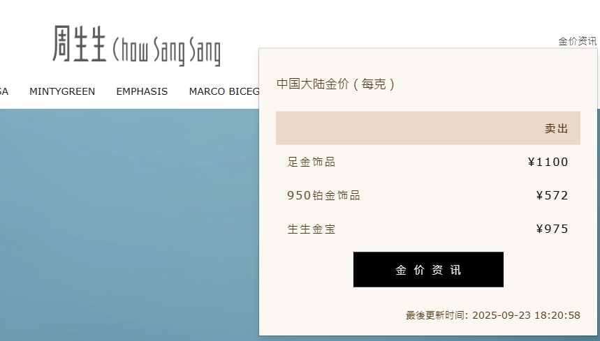 记者发现,截至9月23日18时22分,周生生足金饰品价格报1100元/克,周大福、六福珠宝等品牌足金首饰价格则报1098元/克。