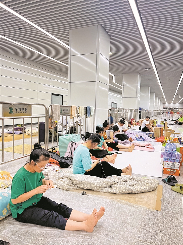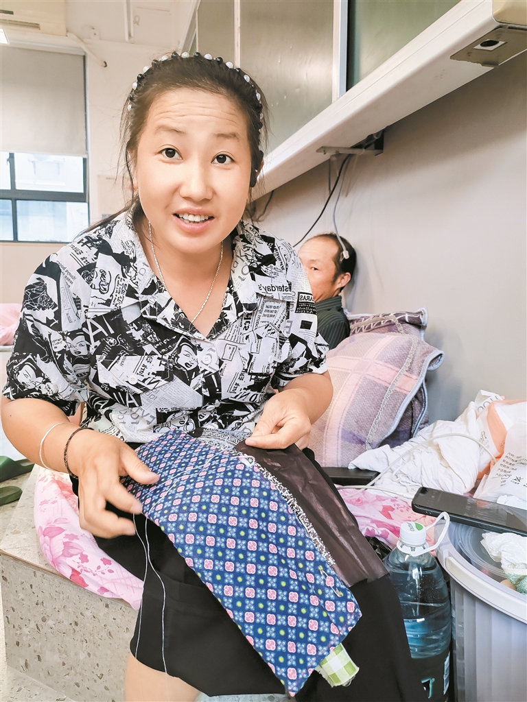 ▲文锦中学安置点,李女士正在绣花。 深圳晚报记者 易芬 摄