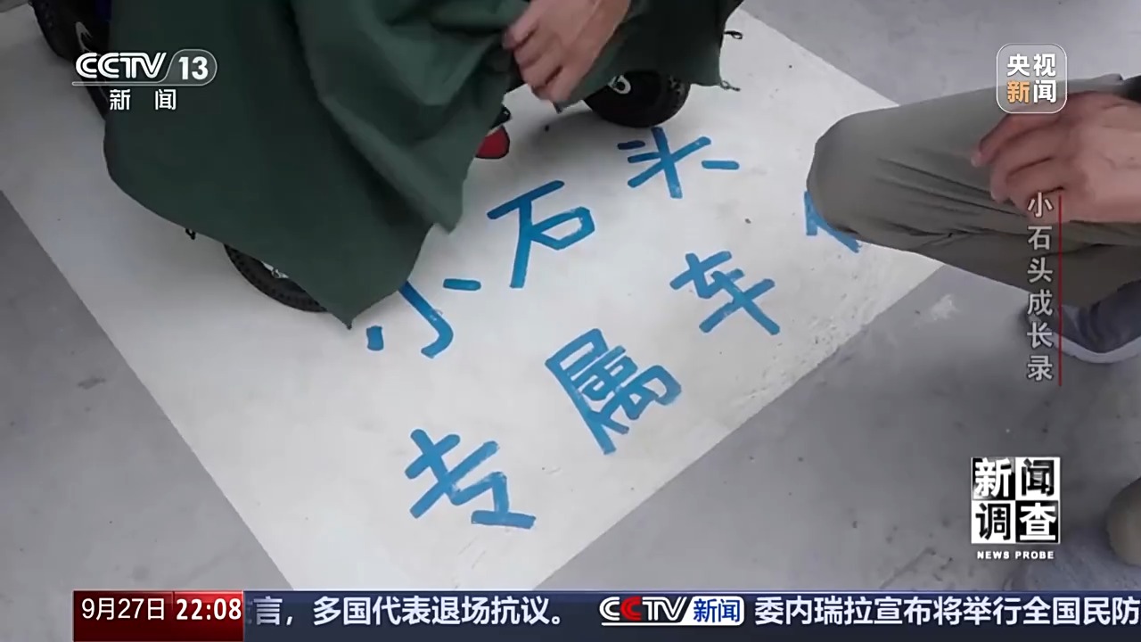学校在小石头班级的门前台阶铺了坡道,班主任也把小石头的座位安排在了进出门最方便的地方,在学校教职工停放电动车的地方还给小石头的电动轮椅预留了车位。最暖心的是给陪读的爷爷安排了专门的座位和休息室,小石头在学校也一天天找到了适合自己的学习方式。