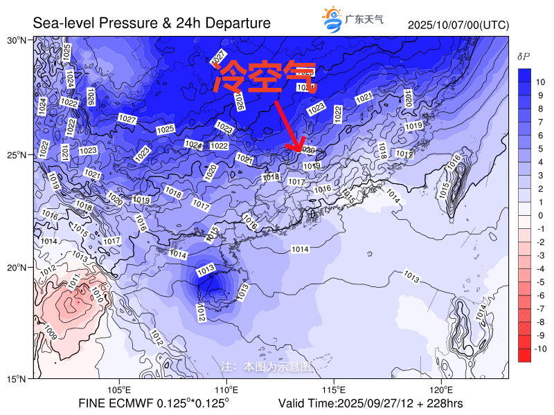 假期后期(10月7-8日),有弱冷空气南下影响广东,气温小幅下降,部分市县有阵雨。