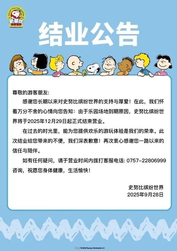 ● 9月28日,位于佛山市的史努比缤纷世界发布《结业公告》,将于2025年12月29日起正式结束营业。