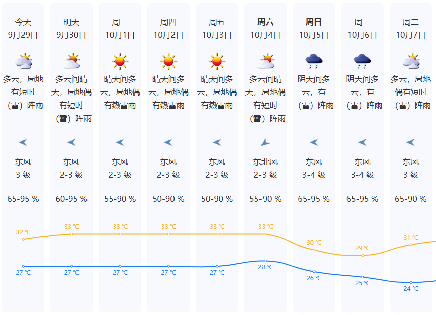 29日多云,局地有短时(雷)阵雨;气温27-32℃;偏东风3级左右;相对湿度65%-95%。