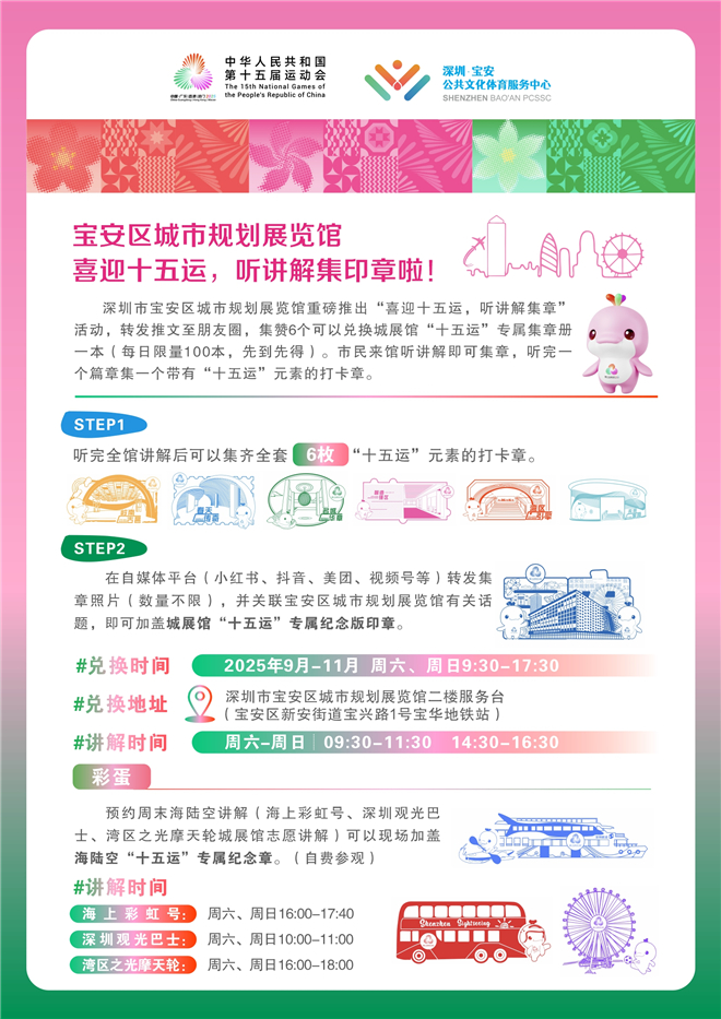 ● 宝安:国庆假期期间,宝安城市规划展览馆推出“集章赢好礼”活动,参与者有机会赢取游轮票等大奖。
