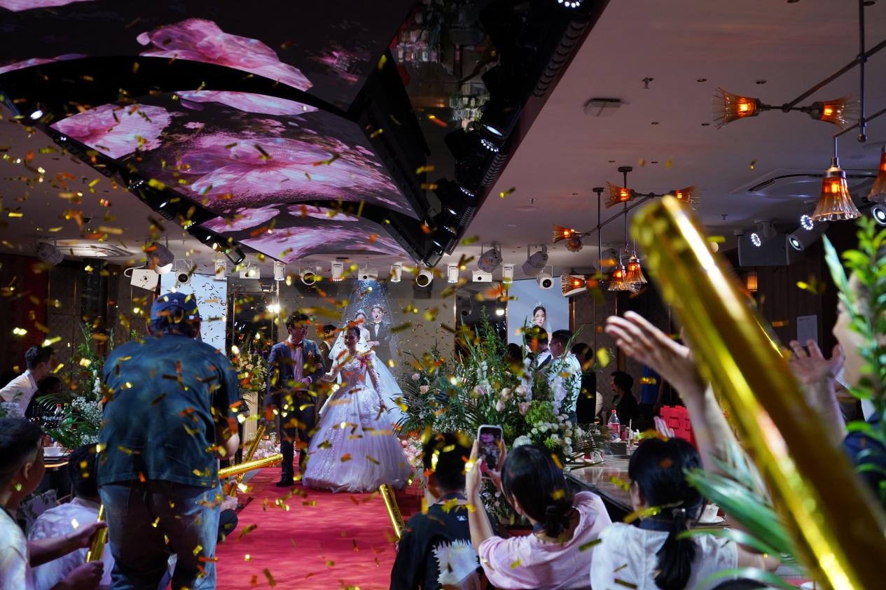 婚礼当日,沸腾的火锅散发着熟悉的香气,大屏幕上循环播放着婚纱照,舞台灯光照亮新人欢乐的笑容,变脸、捞面表演替代传统仪式,刮刮乐代替传统迎宾,亲朋好友在轻松自在的氛围中共同举杯。年轻人用一场别开生面的婚宴,重新定义他们对生活仪式的理解——用真诚与欢乐见证幸福。