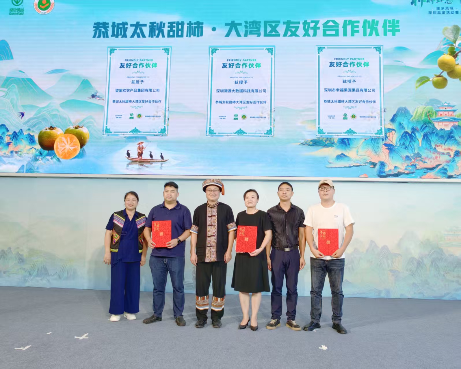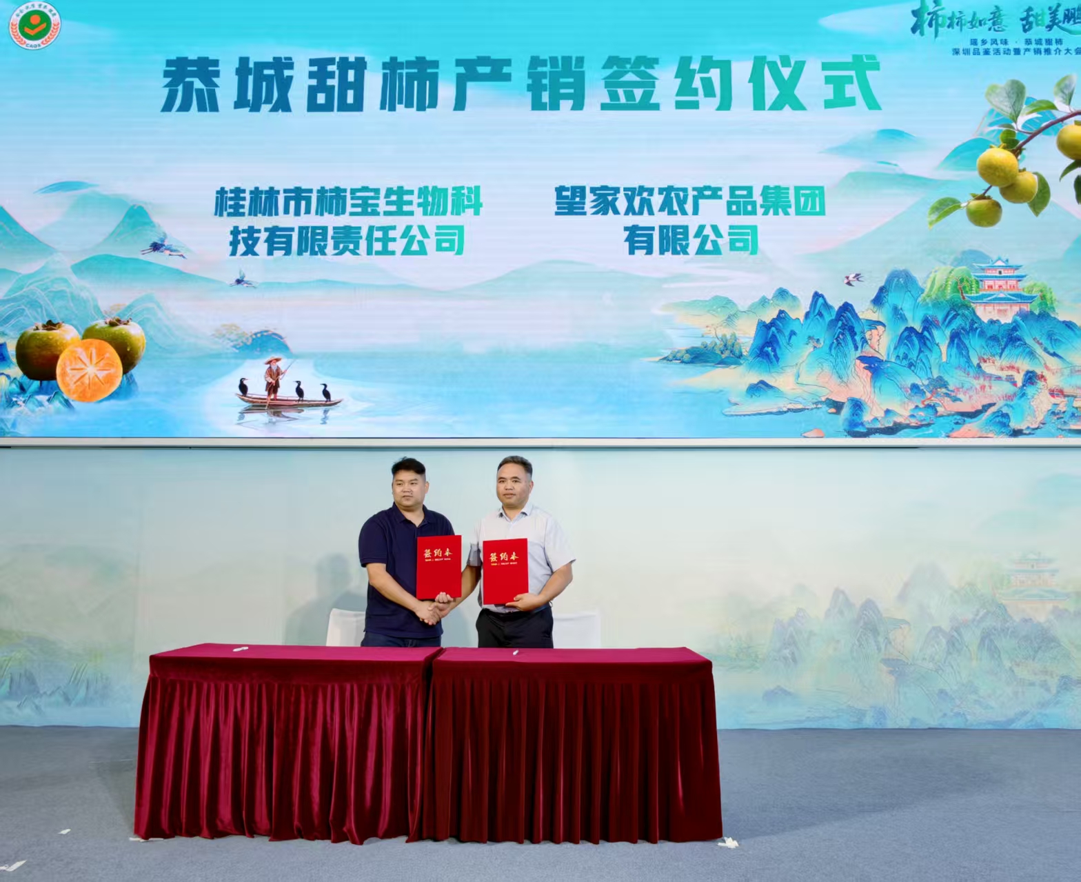 在产销签约仪式上,桂林柿宝生物科技有限责任公司与望家欢农产品集团有限公司签署供需合作协议;恭城润林甜柿专业合作社与深圳溯源大数据科技有限公司签署战略合作协议;恭城绿水青山果蔬专业合作社与深圳市幸福果源果品有限公司签署战略合作协议。据了解,本次意向签约金额合计达2430万元。