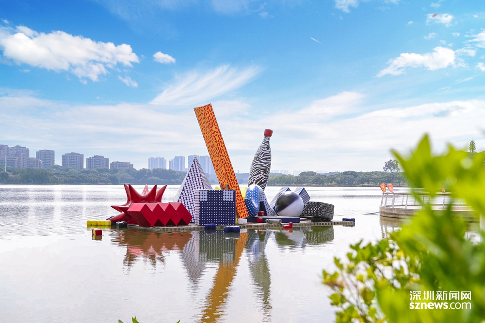 来自香港的艺术家阮文韬与阮允晴,在松山湖湖面上呈现的《数字雨林》,成为公共艺术板块的亮点之一。这款湖面悬浮装置,灵感源自童年记忆中的“宝可梦”游戏角色,喷火龙、暴鲤龙等经典形象被解构重置,低多边形建模与动画风格碰撞出独特形态。