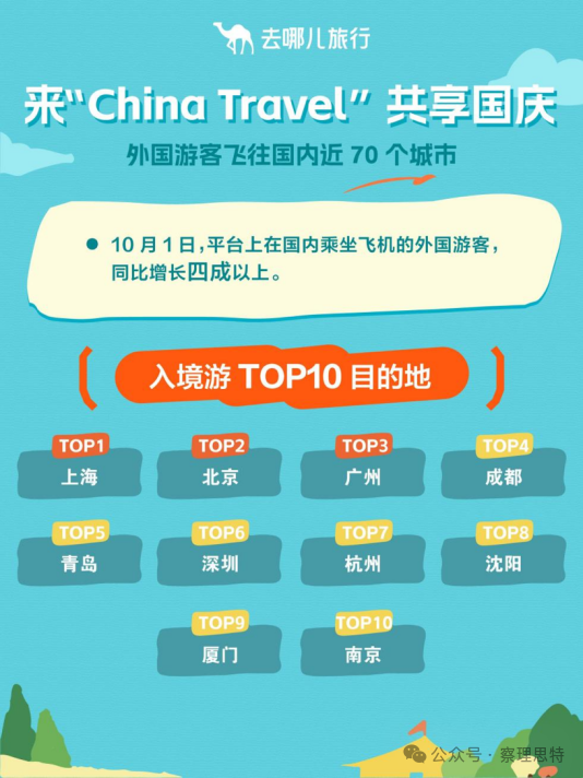 另外,10月1日,去哪儿平台上在国内乘坐飞机的外国旅客数量同比增长四成以上,这些旅客飞往了国内70个城市。其中,入境游TOP10目的地城市是:上海、北京、广州、成都、青岛、深圳、杭州、沈阳、厦门、南京。