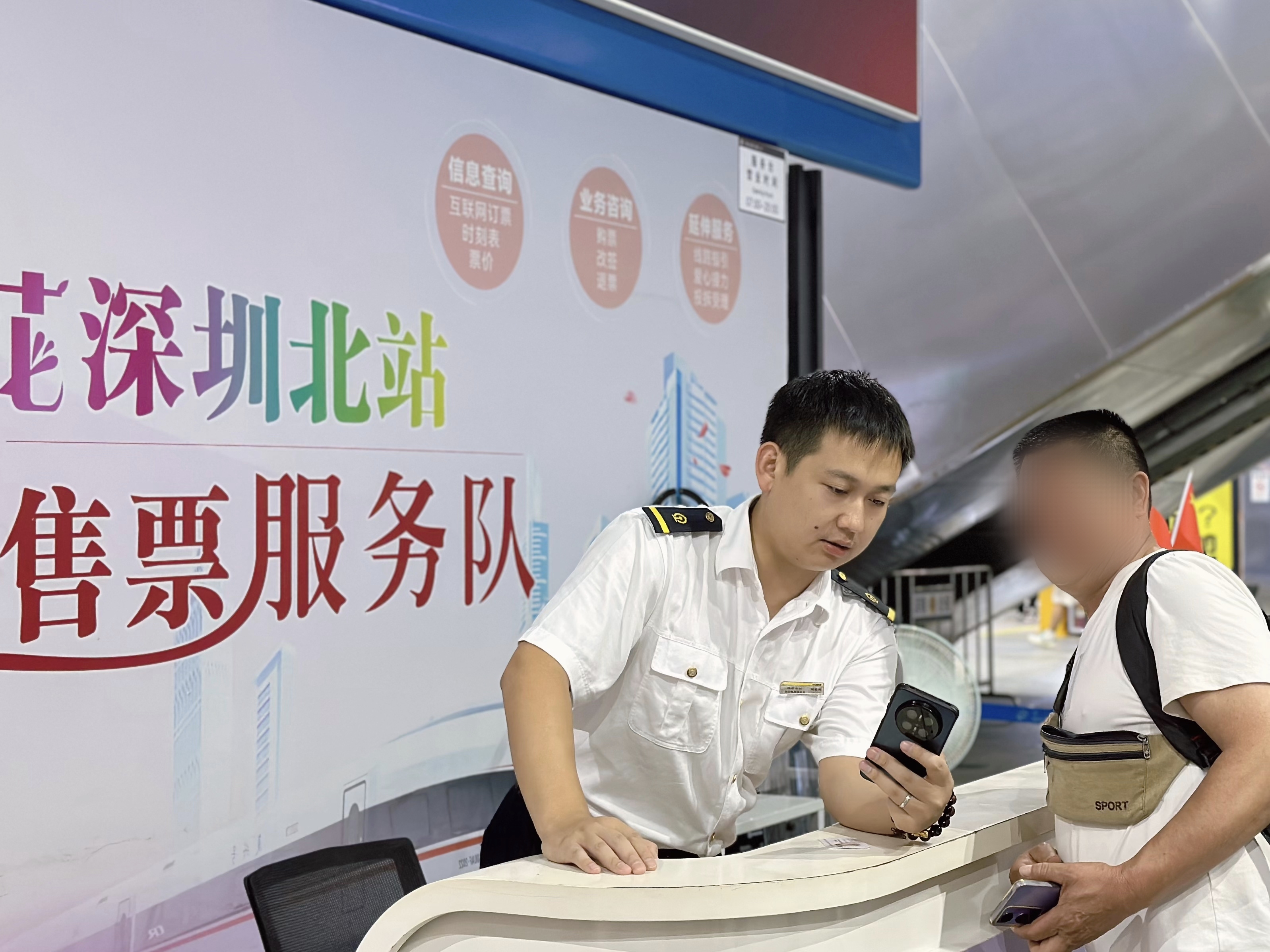 上午7时,深圳北站售票大厅客流渐增,增援引导岗位的陶鑫建正忙碌着,一位老人拍了拍他的肩膀问,“小伙子,我买好了车票,不知乘车怎么找检票口。”