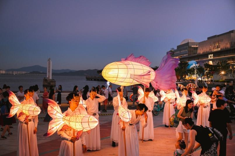 作为农耕文化与海洋文化深度融合的民间艺术产物,鱼灯舞在岭南传统民俗中具有重要意义,深圳沙头角鱼灯舞也被列入国家级非物质文化遗产。双节期间,K11 ECOAST海滨文化艺术区特邀湾区民俗艺人演绎“非遗鱼灯漫巡”,并响应湾区夜间经济发展态势,搭建“夜游、夜赏、夜娱” 等互动场景,焕新演绎非遗的现代叙事。