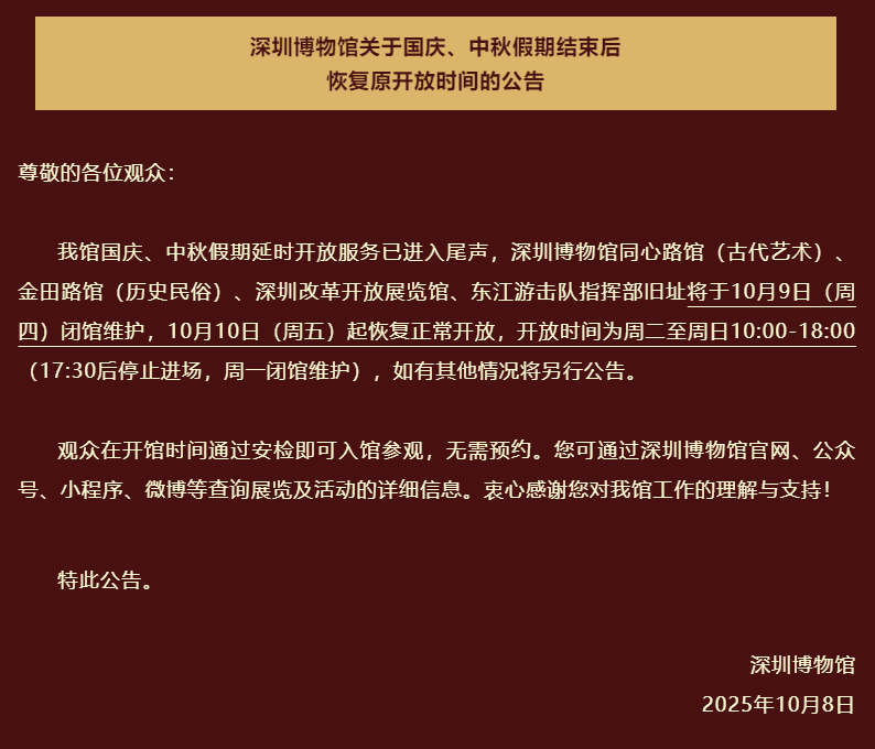 ●深圳博物馆于10月9日闭馆维护。