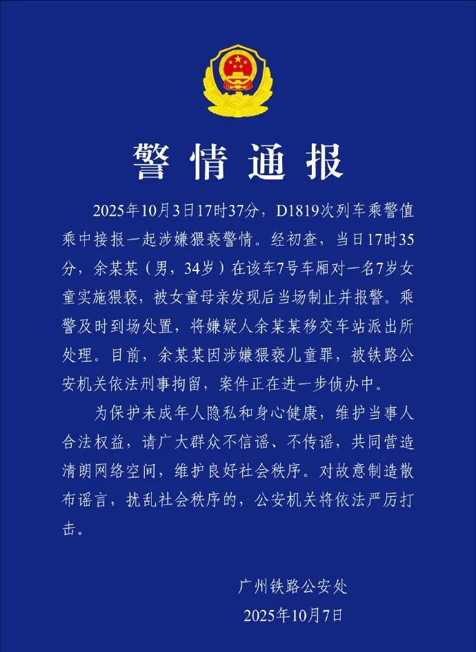 ●近日,一男子对高铁邻座陌生的8岁女孩又亲又抱引热议。7日,广州铁路公安处发布通报:余某某因涉嫌猥亵儿童罪被刑事拘留。