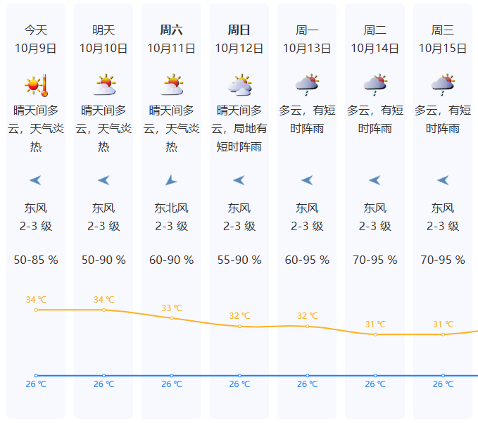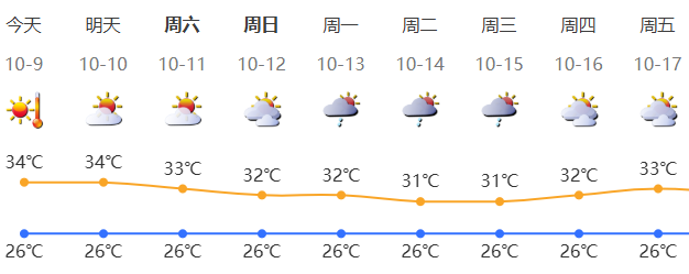 9-11日晴天间多云,天气炎热,局地有短时阵雨,其中9日气温26-34℃,中北部和人口密集区最高气温可达35-36℃;