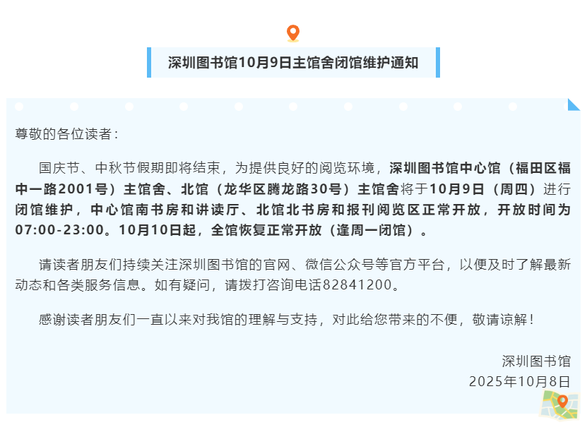 ● 10月9日,深圳图书馆中心馆(福田区福中一路2001号)主馆舍、北馆(龙华区腾龙路30号)主馆舍闭馆维护。