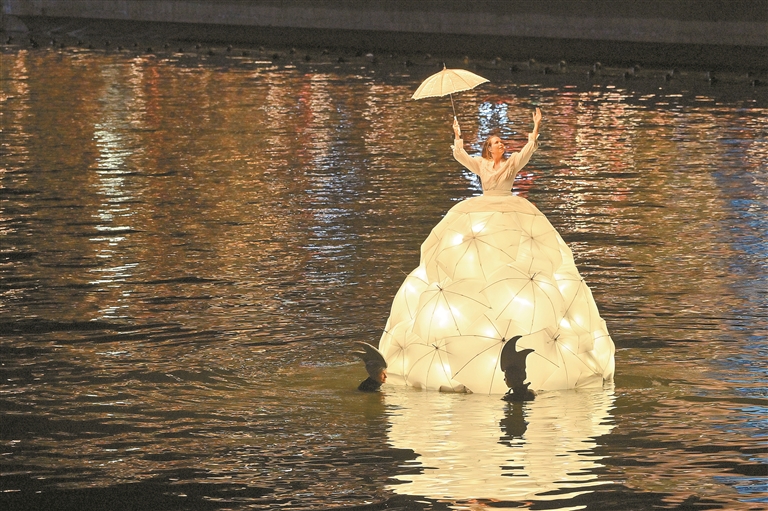 记者在现场看到,来自荷兰的女歌唱家身着巨大伞状礼服,漂浮于海面,用经典歌剧咏叹调的形式向观众演绎中国经典曲目。