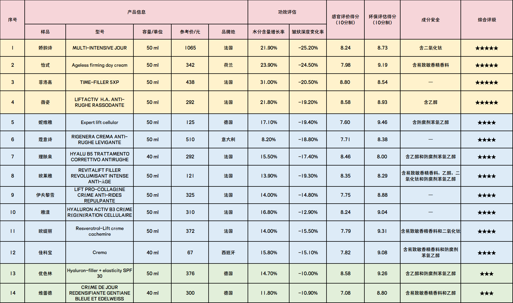 综合各方评价,娇韵诗MULTI-INTENSIVE JOUR、怡式Ageless firming day cream、菲洛嘉TIME-FILLER 5XP、薇姿 LIFTACTIV H.A. ANTI-RUGHE RASSODANTE四款样品获得五星评级。优色林Hyaluron-filler + elasticity SPF 30、维蕾德CRÈME DE JOUR REDENSIFIANTE GENTIANE BLEUE ET EDELWEISS位居榜单后两位,仅获三星评级。(本文图片由深圳市消委会提供)
