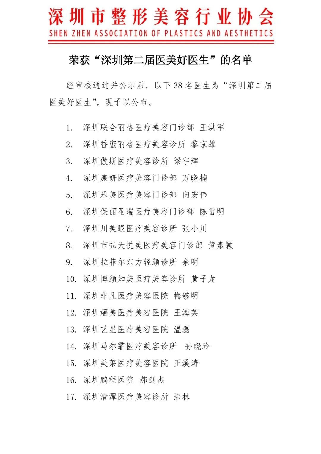 (记者 翁瑞峰)近日,深圳市整形美容行业协会公布了“深圳第二届医美好医生”名单,一共有38名医生获得该称号。