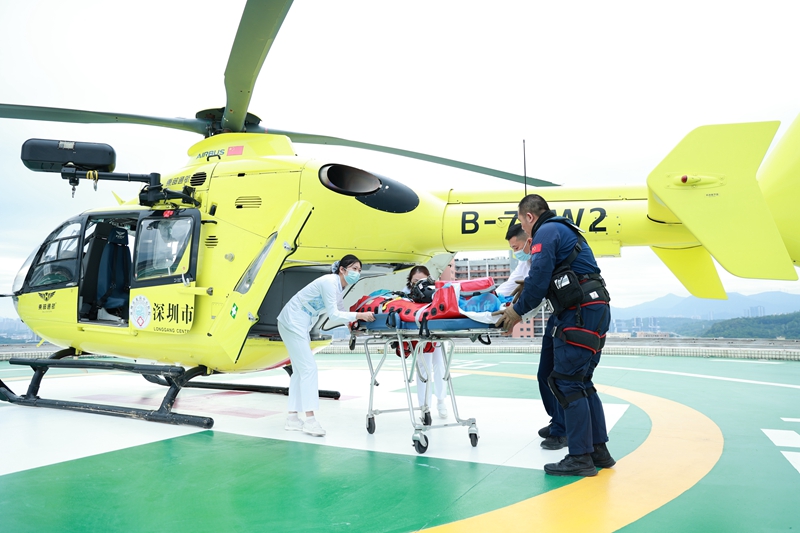 与会嘉宾实地参观了龙岗中心医院,重点考察了国家应急医学研究中心深圳基地在航空医疗救援、急诊救治体系、低空救援流程及智能化应急医学装备等方面的建设应用情况。