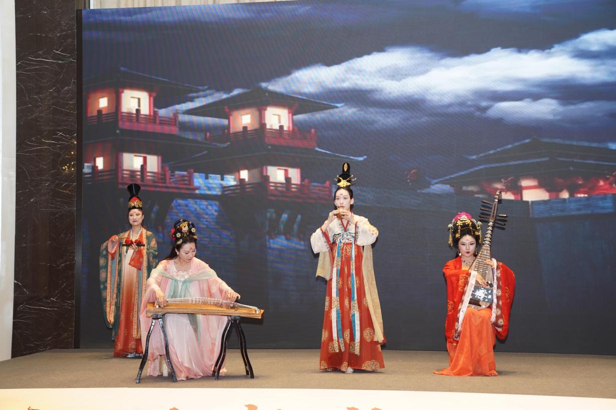 随着汉乐《汉韵悠扬》演奏者上台,活动拉开帷幕,身着汉服的演奏者以古筝、箜篌、陶埙交织出两汉底蕴,台下参会者纷纷举起手机拍照。