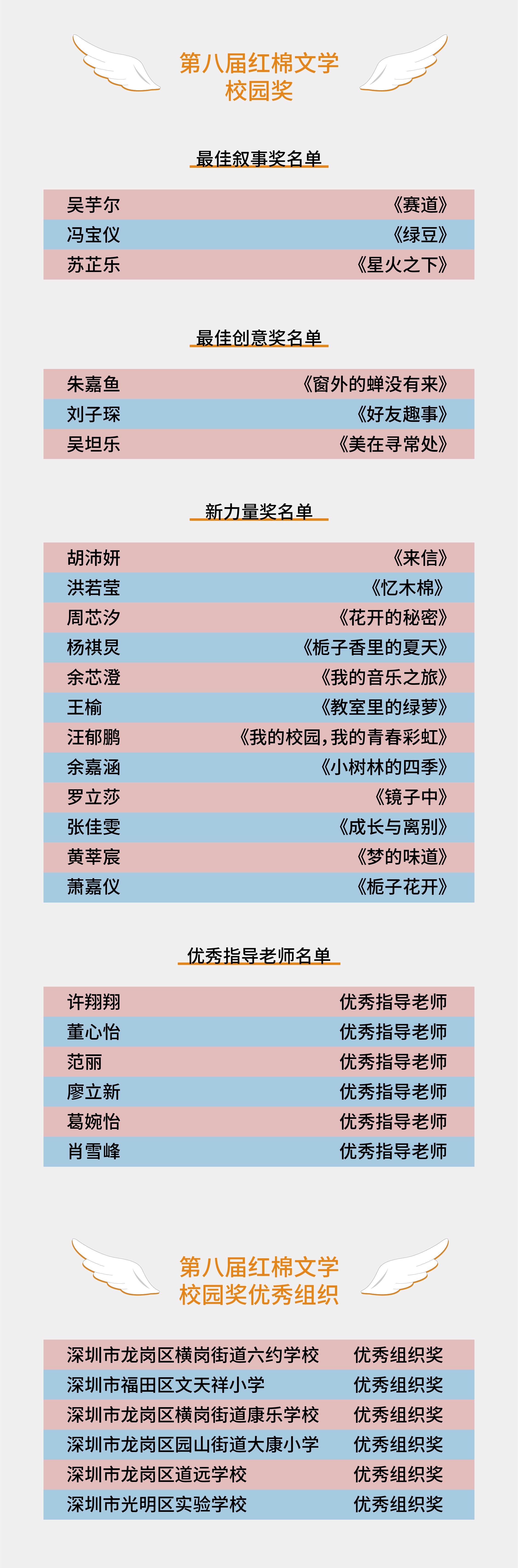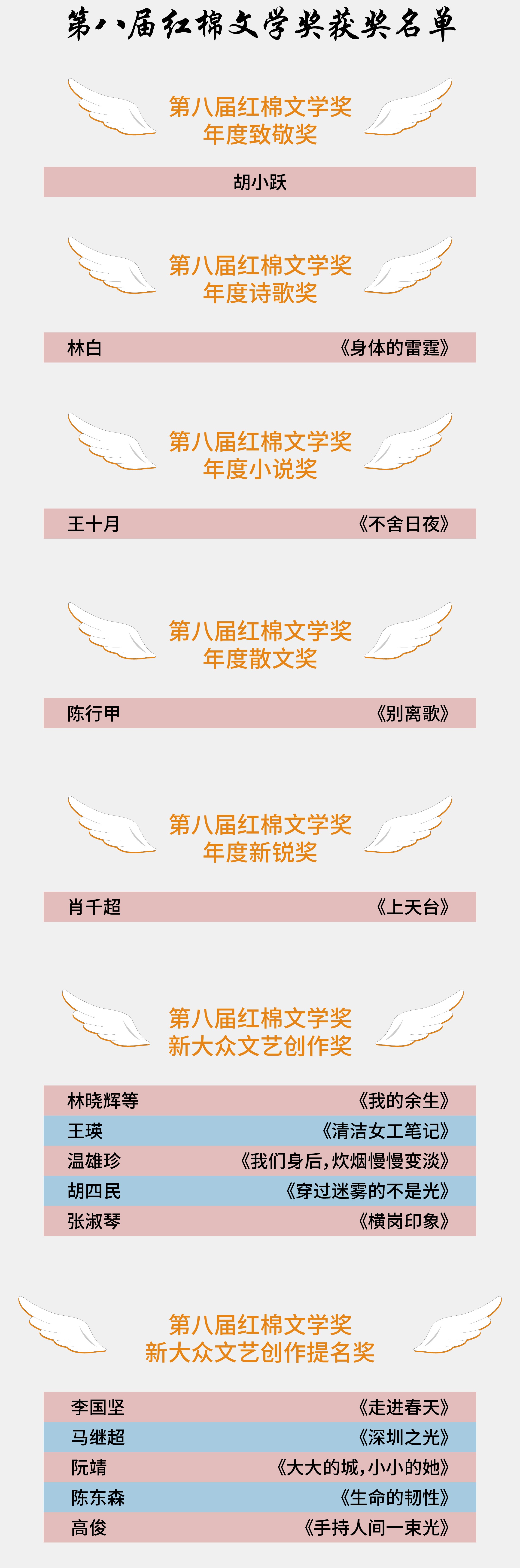 据悉,第八届红棉文学奖评委会由国内著名作家和学者组成,采取双向匿名方式评审,赛事坚持公开、公平、公正的原则,共200篇(部)作品进入终评。鉴于本届新大众文艺创作的稿件数量较多,为鼓励新大众文艺创作,特增设新大众文艺创作提名奖,由主办方颁发证书。经评委会评选,获奖名单正式揭晓。