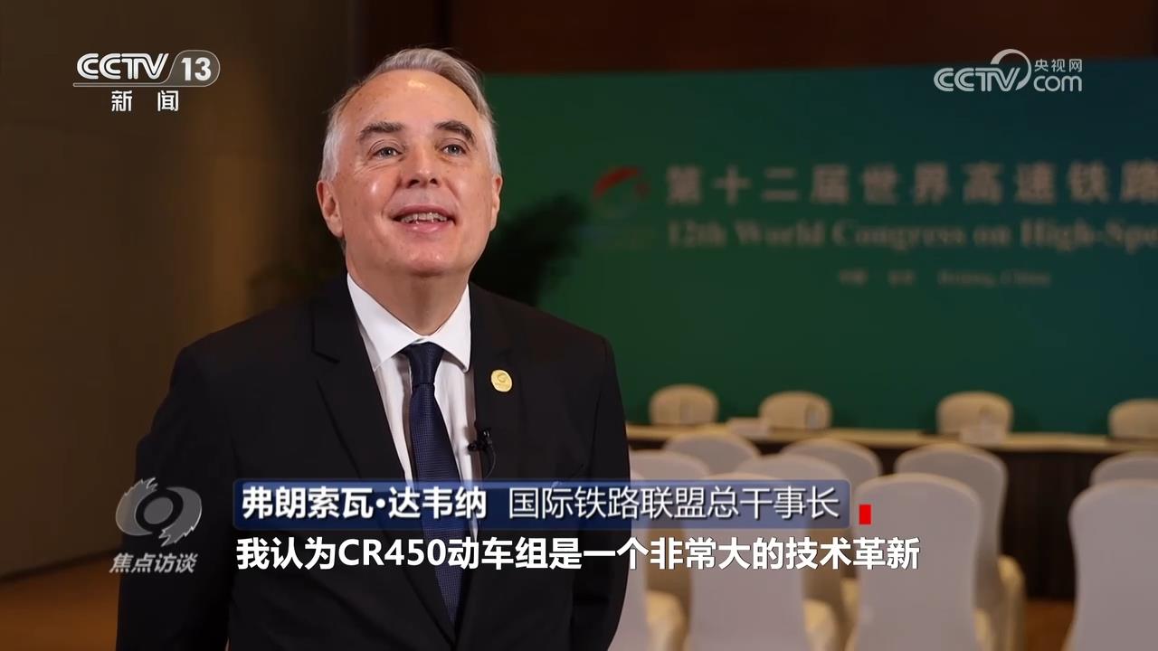 国际铁路联盟总干事长弗朗索瓦·达韦纳:“我认为CR450动车组是一个非常大的技术革新,从350公里时速到400公里时速将极大提升铁路的竞争力,将在未来实现更高的商业速度提升铁路的优势,技术人员攻克了很多技术难题,我非常期待未来能乘坐时速400公里动车组来实现一次旅行。”