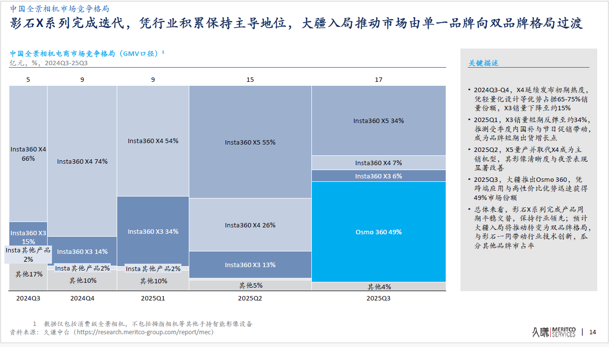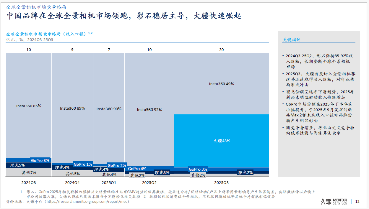 全景相机的市场格局也迎来激烈变动。大疆于今年7月31日入局该领域,在不到三个月的时间内,其首款全景相机Osmo360,凭借跨端应用与高性价比的优势,分别在中国电商渠道获得了49%的市场份额,全球市场份额达43%。加速推动全球全景相机市场格局重构。