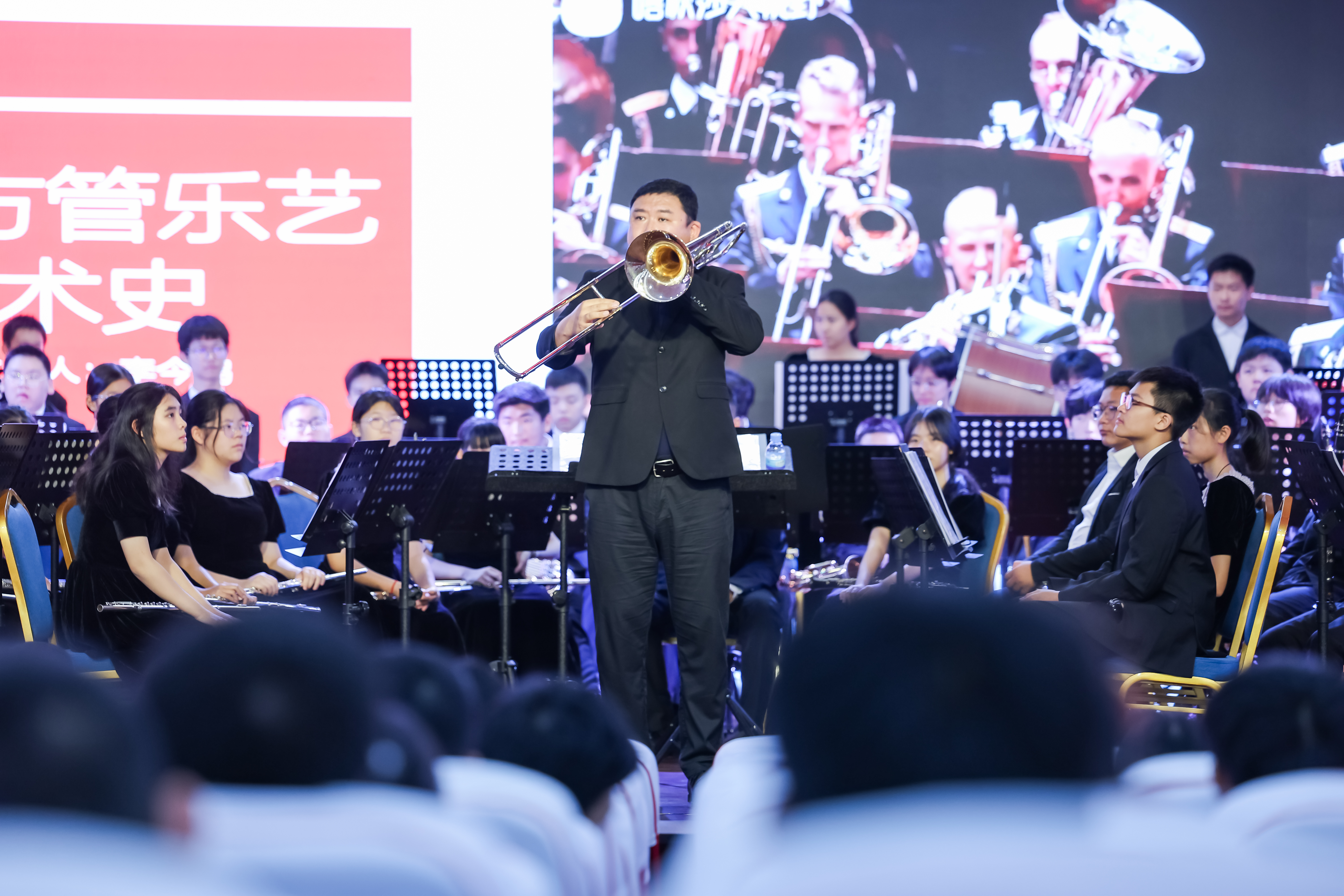 活动现场,李今鹏教授以深入浅出的讲解和精彩的现场演奏,为数百名师生带来了一场难忘的艺术体验。他结合自身丰富的演奏与教学经验,以生动易懂的语言和专业视角,深入讲解了乐器练习技巧与音乐作品的艺术价值,使在场师生能够轻松感受音乐的魅力。在讲解过程中,李教授还即兴演奏了《嘎达梅林主题幻想曲》和《里姆斯基降B大调长号协奏曲》等经典作品,精湛的技艺和富有感染力的表现赢得了师生们的阵阵掌声,将现场气氛推向高潮。随后,李教授对莲花中学交响管乐团的现场演奏进行了专业点评和指导。