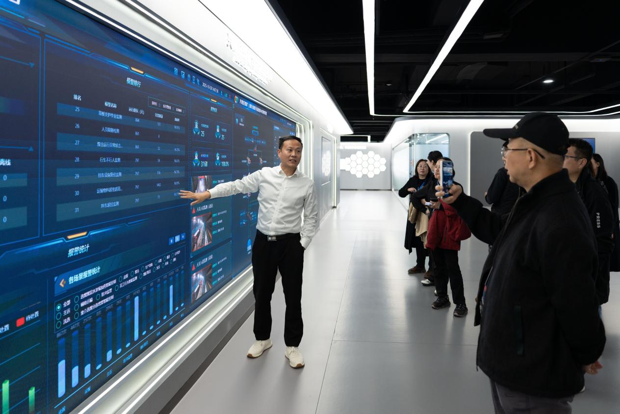 云鼎科技工业互联网事业部总经理王磊(左一)为媒体记者介绍大模型运行情况