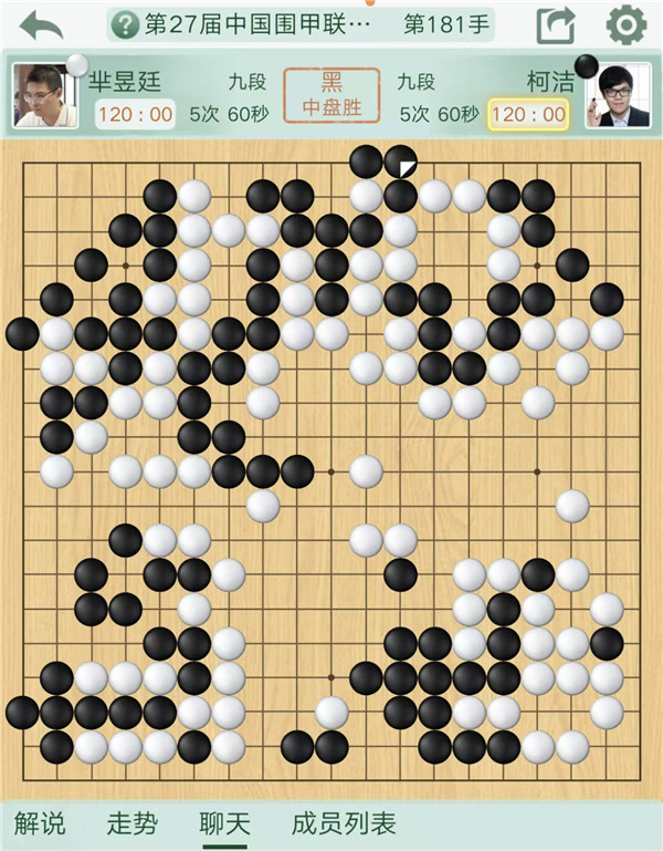 柯洁执黑胜芈昱廷。开局右下角战斗中,白棋出现判断失误导致转换后黑棋局势大幅领先。由于局势不利,之后上边白棋行棋过于强硬,黑棋毫不手软,将左上白棋吃掉后,黑胜势。