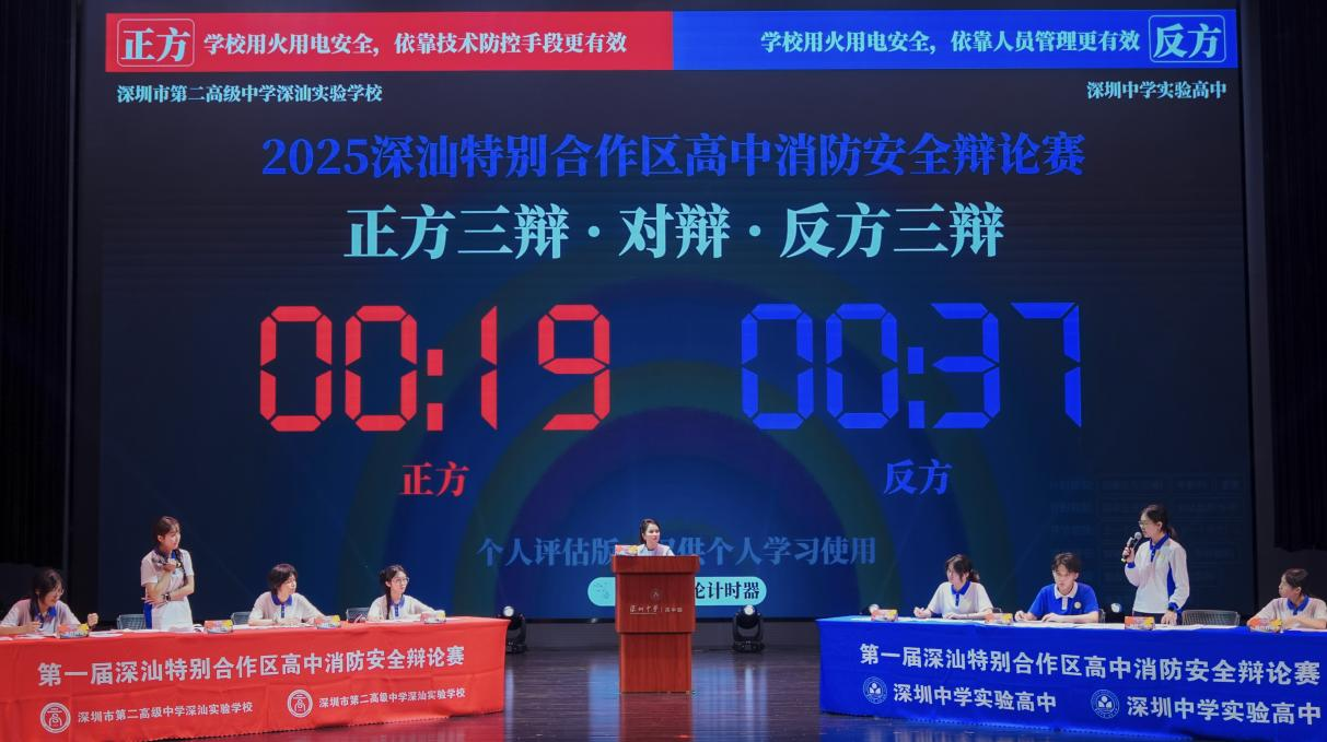 历经初赛角逐,深圳市第二高级中学深汕实验学校与深圳中学实验高中展开巅峰对决。双方围绕“学校用火用电安全依靠技术防控还是人员管理更有效”辩题展开激烈交锋。选手们引用《消防安全责任制实施办法》等法规,结合校园火灾案例,从技术精准防控与人员职责管控等角度剖析,将消防知识融入思辨,让师生在思想碰撞中深化消防安全认知。