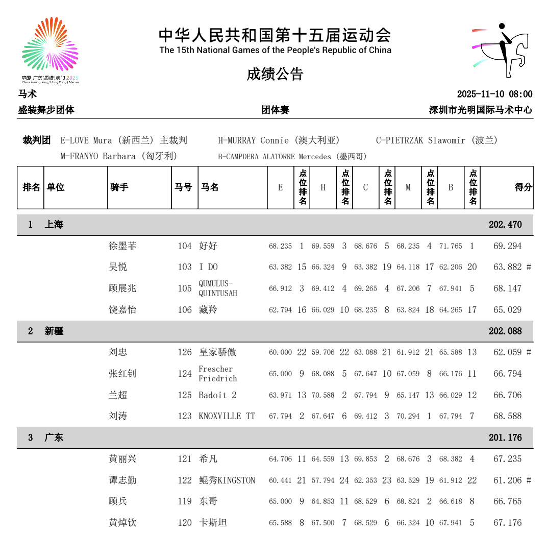 ● 全运开幕后深圳赛区首金诞生,马术盛装舞步团体赛上海队夺冠。