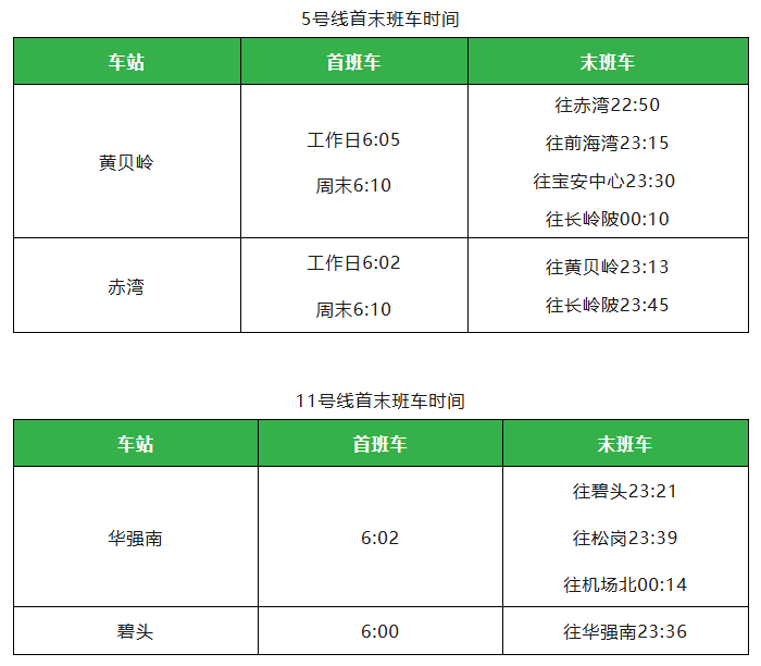 ●深圳地铁5号线、11号线首末班车时间有微调。
