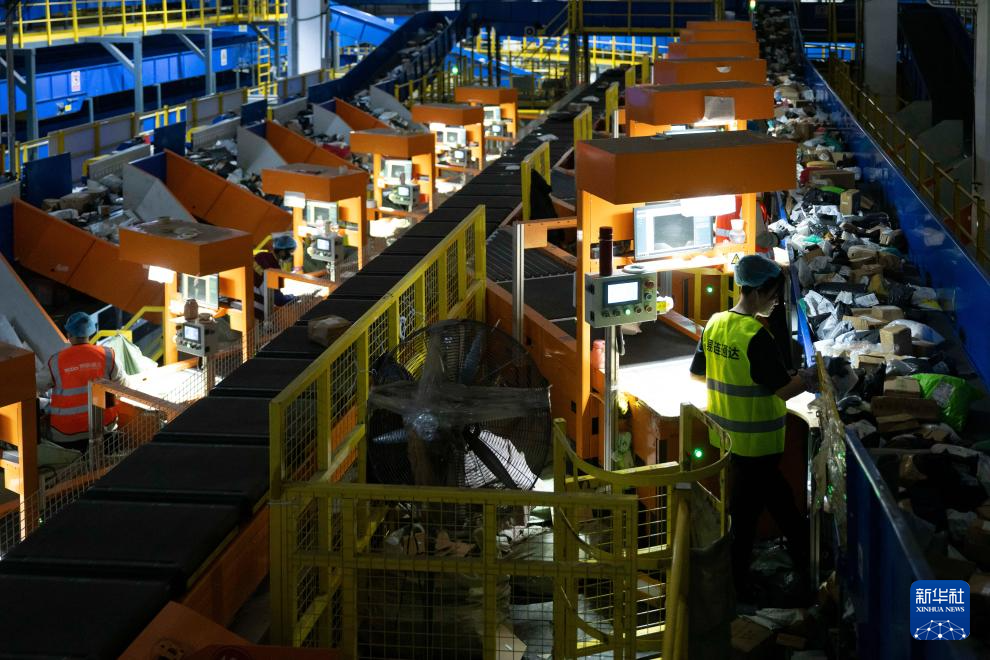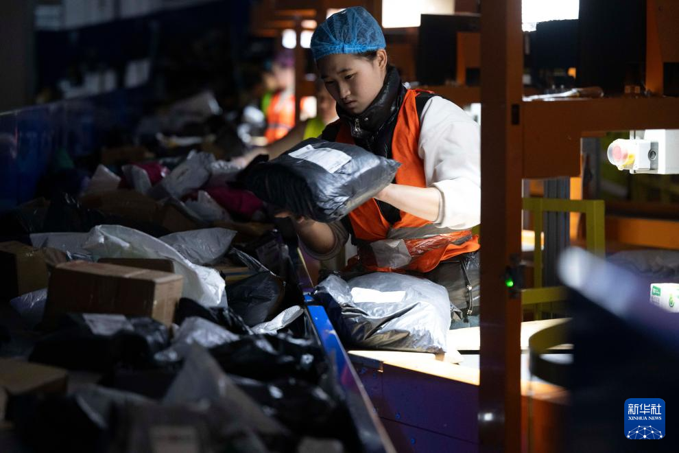 11月10日晚,在中国邮政集团有限公司黑龙江省哈尔滨邮区中心,工作人员在分拣快递。新华社记者 张涛 摄