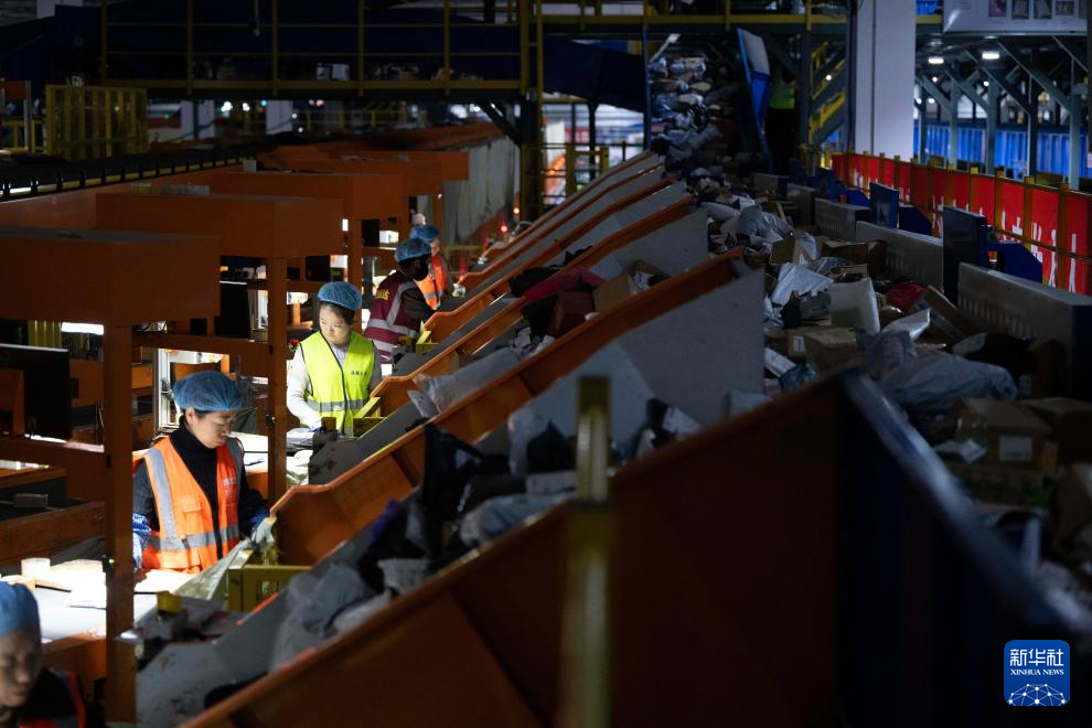 11月10日晚,工作人员在中国邮政集团有限公司黑龙江省哈尔滨邮区中心作业。新华社记者 张涛 摄