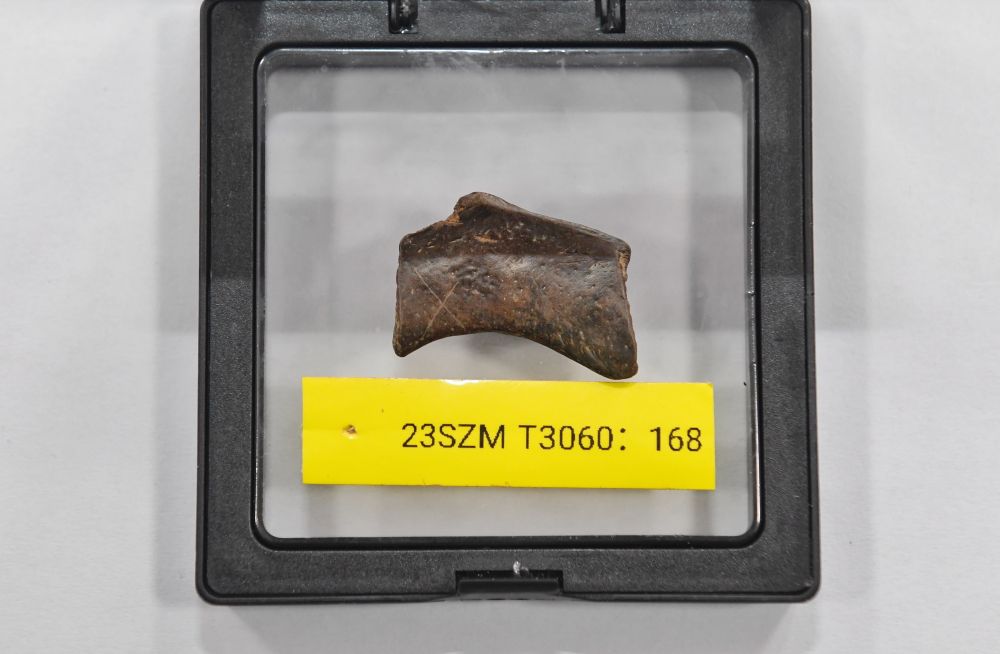 2023年12月5日拍摄的从四川资阳濛溪河遗址群出土的有X形划痕的骨器。该遗址是国际罕见的同时包含丰富石器、动物与植物遗存的“全科型”遗址,入选了“2024年度全国十大考古新发现”.