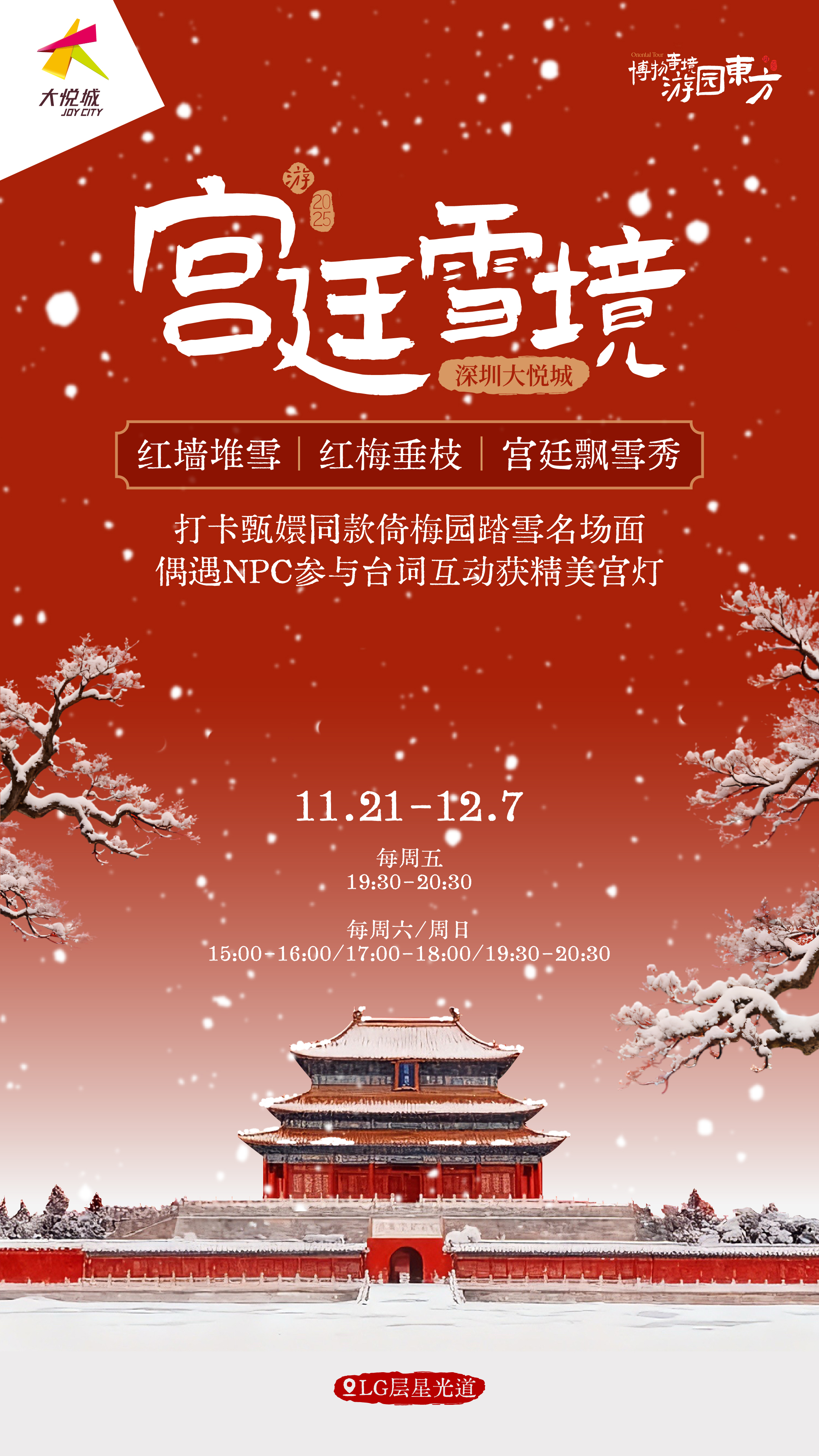 本次活动的核心,是于商场内复刻一个极具东方美学的“倚梅园”。场景设计汲取自故宫的红墙白雪与古典园林的造景精髓,通过“红墙堆雪”“红梅垂枝”等标志性元素,将小说与影视剧中描绘的踏雪寻梅意境变为现实。届时,漫天的人造飞雪将定时降临,为整个空间披上银装,打造一场唯美的“宫廷飘雪秀”,让身处岭南的市民无需远行,即可尽情打卡拍照,感受“深圳初雪”的浪漫氛围。