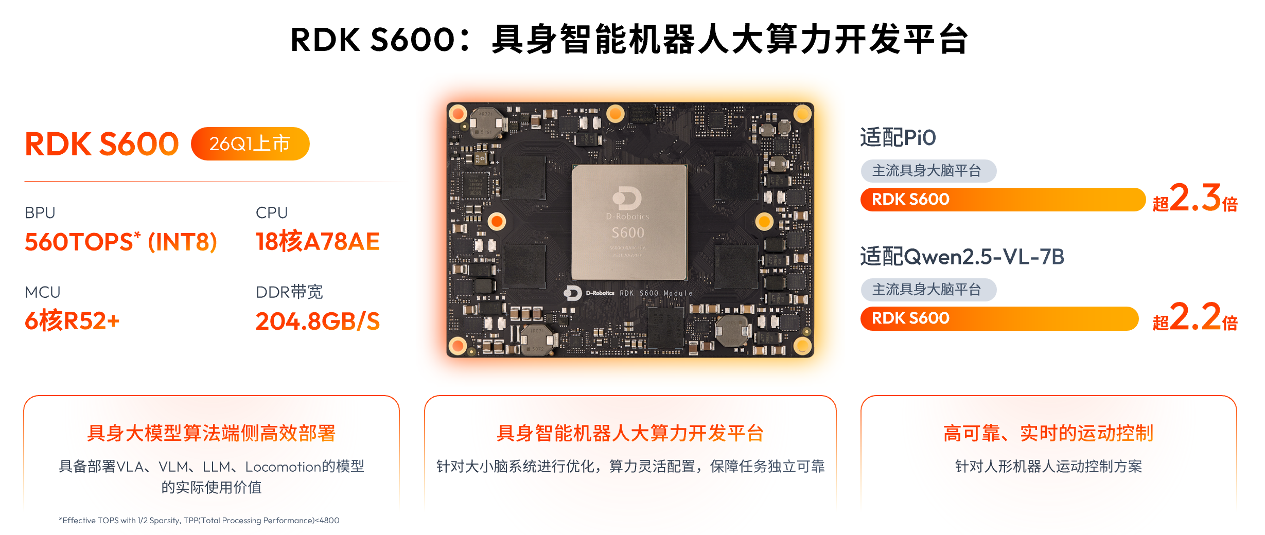 此次亮相的S600拥有560 TOPS*(INT8)算力,采用大小脑架构设计。其大脑配置18核A78AE CPU和全新BPU Nash,可支持多种具身大模型算法端侧部署;小脑配置6核R52+ MCU,专为人形机器人优化,具备高可靠、实时的运动控制能力。