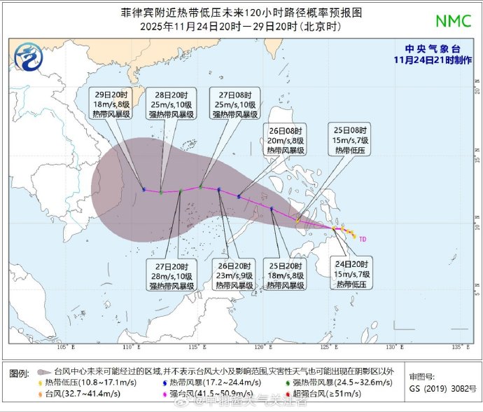 菲律宾以东热带扰动已于11月24日上午加强为热带低压,有可能于未来24小时内加强为今年第27号台风 “天琴”,并于25日夜间进入南海南部海域。
