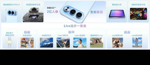 在影像方面,荣耀500全系配备1/1.4英寸大底传感器及1200万超广角镜头,Pro版还搭载5000万双防抖长焦镜头,支持CIPA5.0旗舰级防抖等级。系列机型行业首发前后置Live人像功能,支持6种胶片Live色彩选择,并具备Live路人消除、4K转Live等创新功能。其“破框而出”Live特效通过AI算法实现裸眼3D效果。