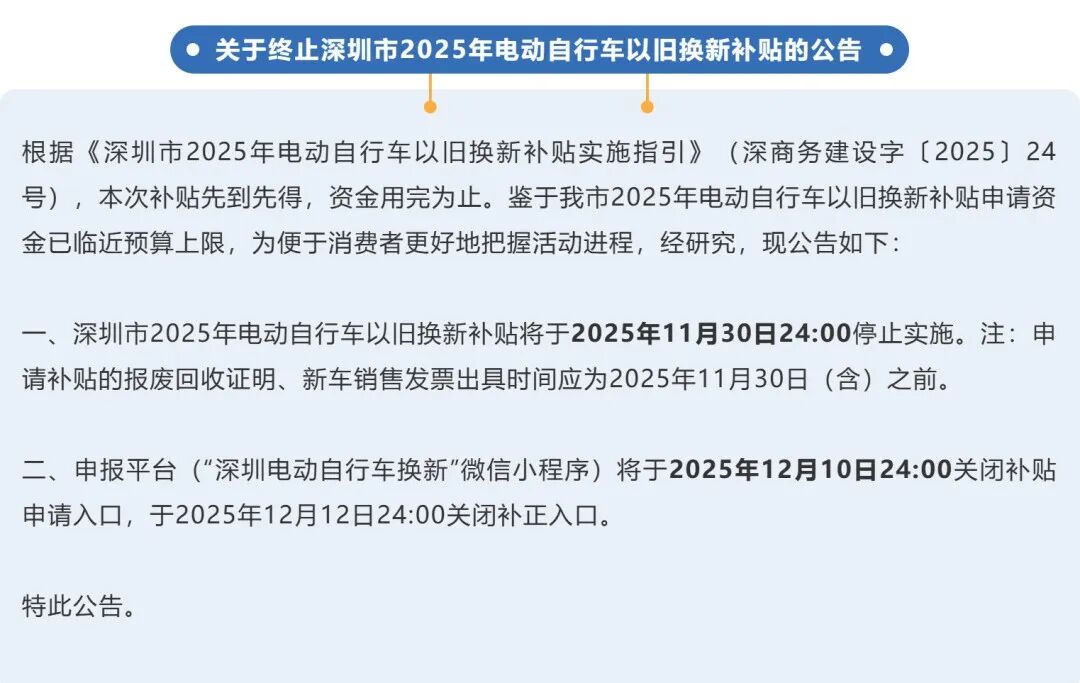 ● 深圳市2025年电动自行车以旧换新补贴将于2025年11月30日24:00停止实施。