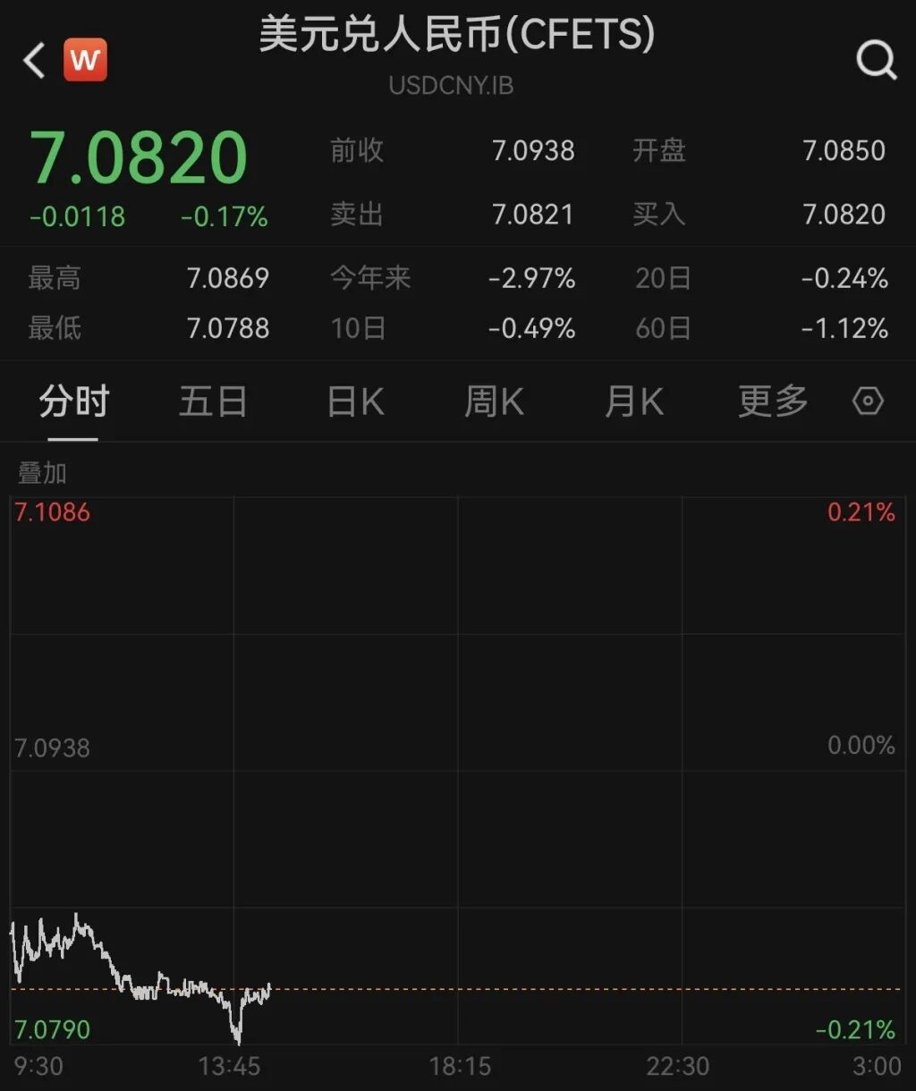 ● 11月26日,人民币对美元即期汇率盘中升破7.08关口,最高至7.0788,创下2024年10月中旬以来的盘中新高。