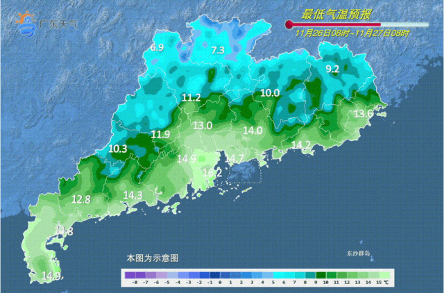 根据广东省气象部门11月26日观测和预计,新一股弱冷空气自27日起补充影响广东。叠加24日起影响广东的弱冷空气,广东的气温将在后续的早晚时段继续下降,28-29日控制广东的冷高压减弱。