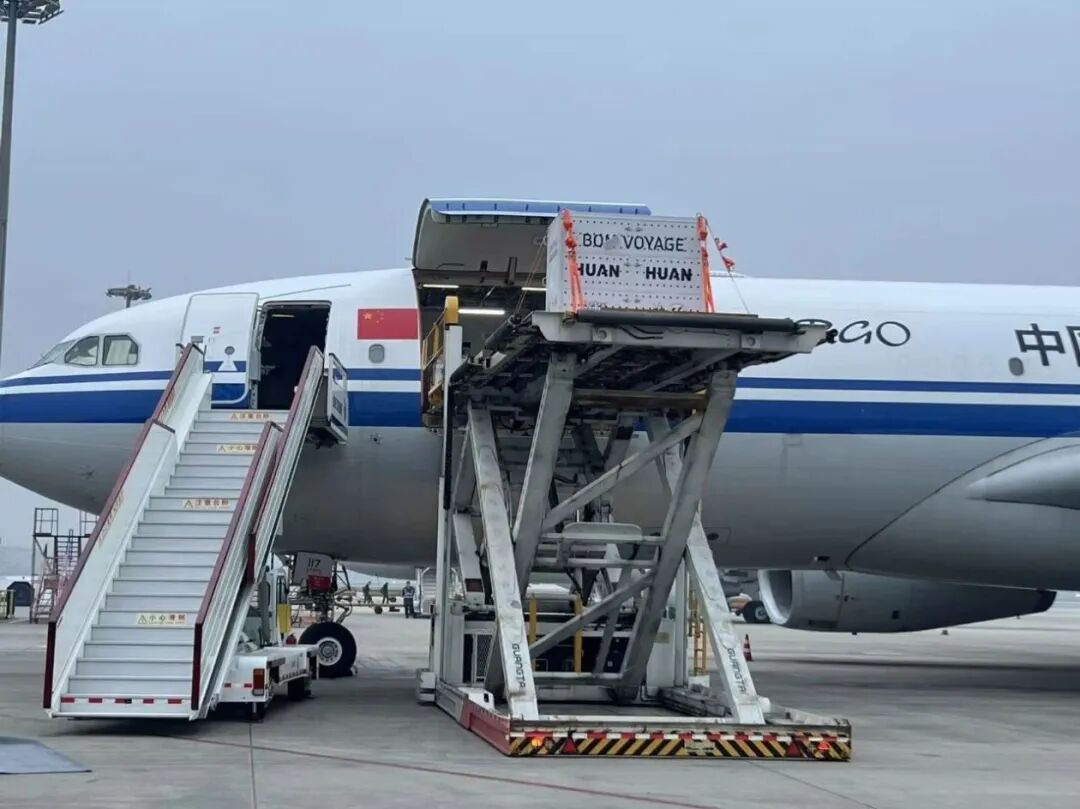 2025年11月26日旅法大熊猫“欢欢”“圆仔”平安回国。图源:央视新闻