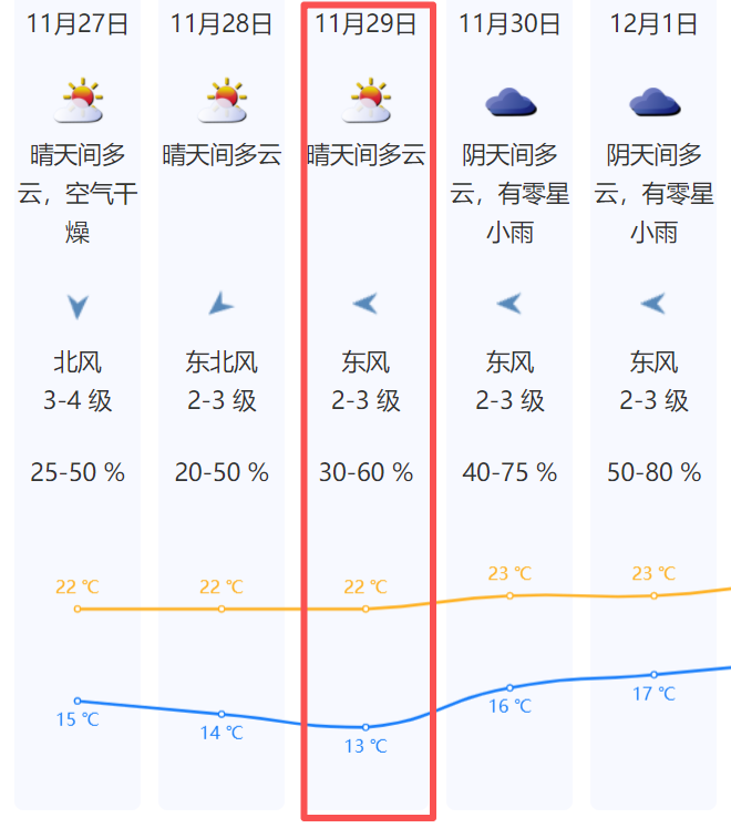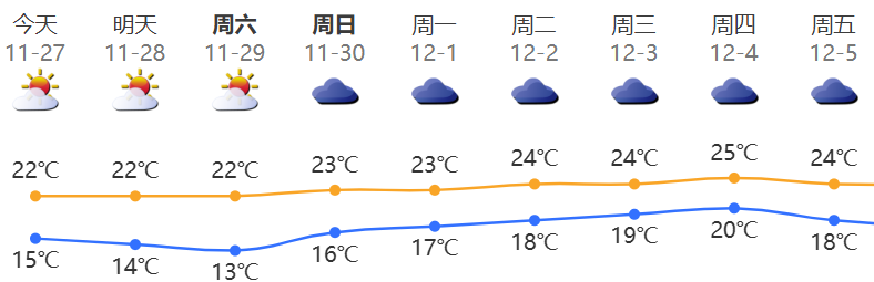 预计11月27日-29日受弱冷空气影响,深圳持续晴天,干燥加剧,气温略降,昼夜温差大,其中11月27日气温15℃-22℃,沿海高地最大阵风8级左右;29日最低温降至13℃。