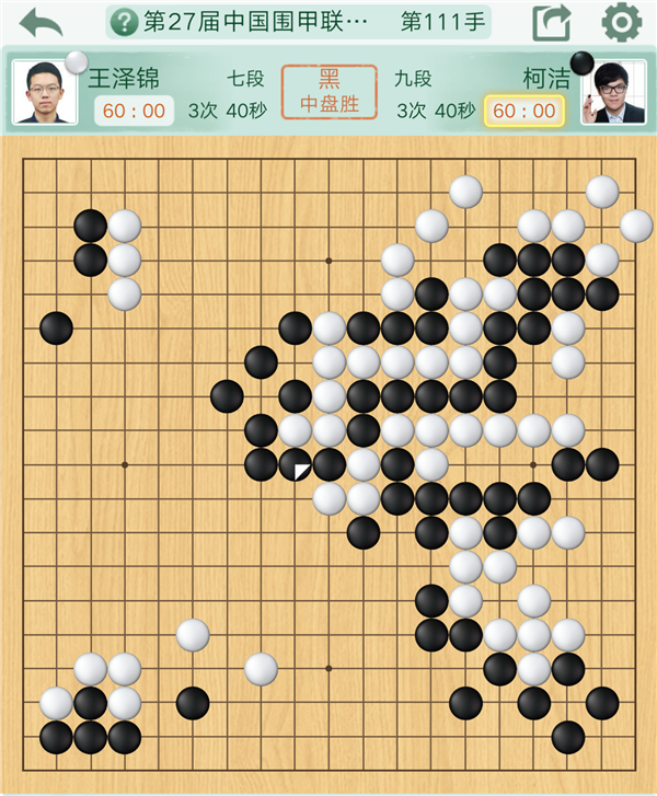 三台,柯洁执黑胜王泽锦。开局时,白棋在右下行棋过份,被黑棋攻击后苦苦做活,黑棋大优势。之后,黑棋攻击中央白棋,将白棋大龙尾巴吃掉,白棋再无斗志,早早认输。