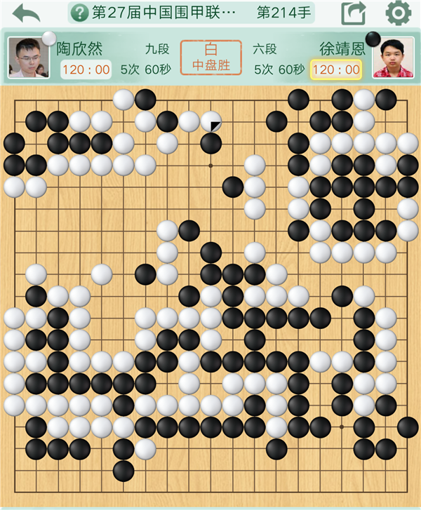 四台,陶欣然执白胜徐靖恩。中盘,左下黑棋计算出现严重失误,被白棋快一气吃掉大龙,损失惨重。之后,白行棋稳健,再无悬念,白棋大胜。