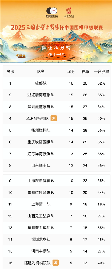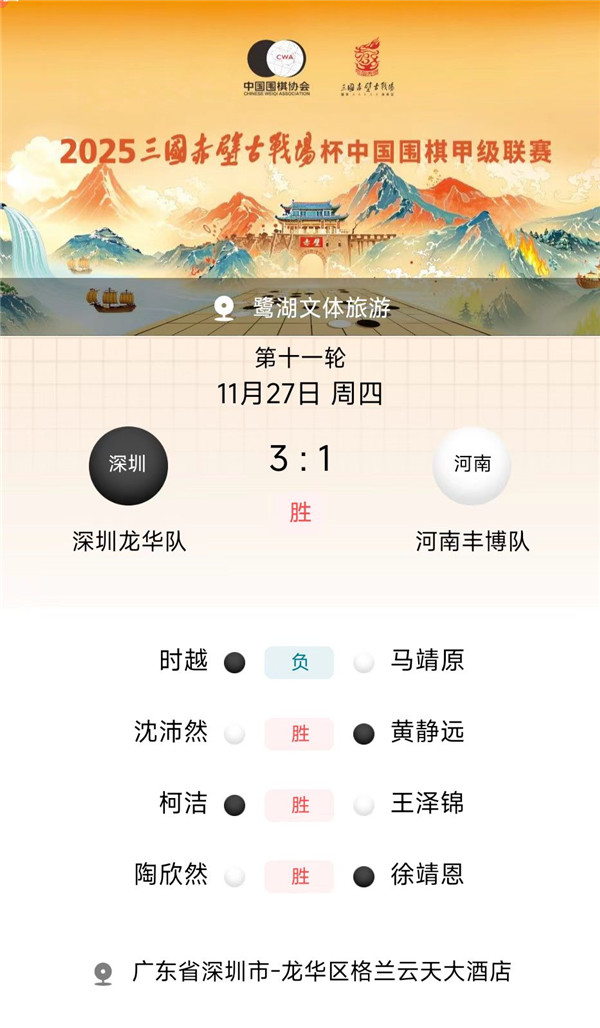 深圳新闻网2025年11月27日讯(记者 周锦春)“2025三国赤壁古战场杯中国围棋甲级联赛”第十一轮鹭湖文体旅游专场在深圳龙华队主场格兰云天大酒店进行,前来挑战的河南丰博队以1:3大败而归。本次比赛中,柯洁、陶欣然、沈沛然各胜一局,助深圳龙华队全取三分,从而在本年度围甲常规赛中首次脱离降级区!目前,深圳龙华队积6分排名第14位,垫底的两队是河南丰博队、福建刺桐棋院队。名列前三的队伍是成都队、浙江浙商证券队、深圳聂道厚势队。