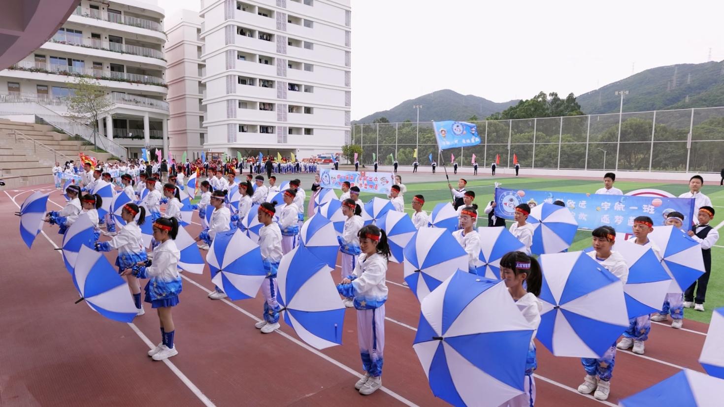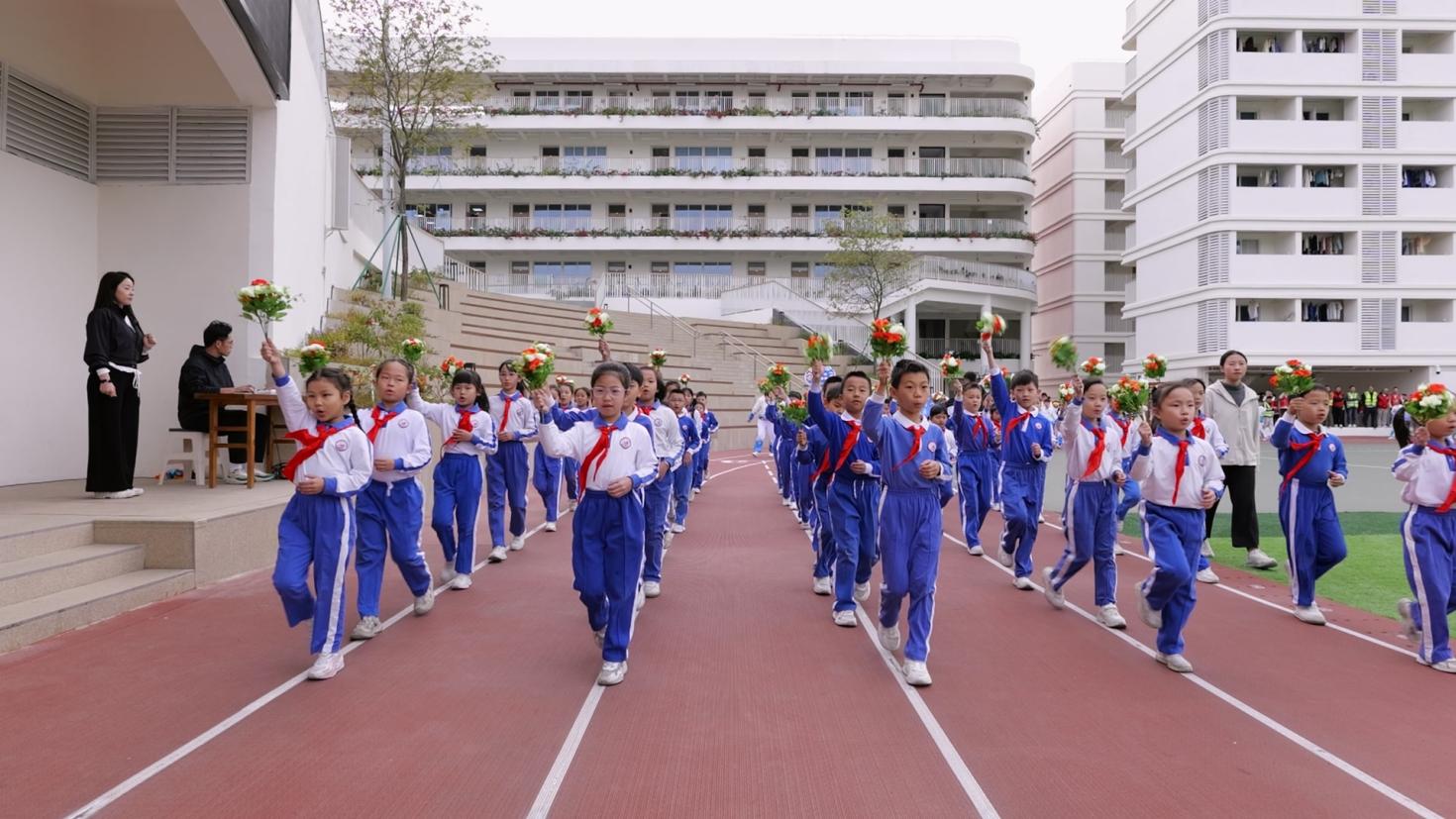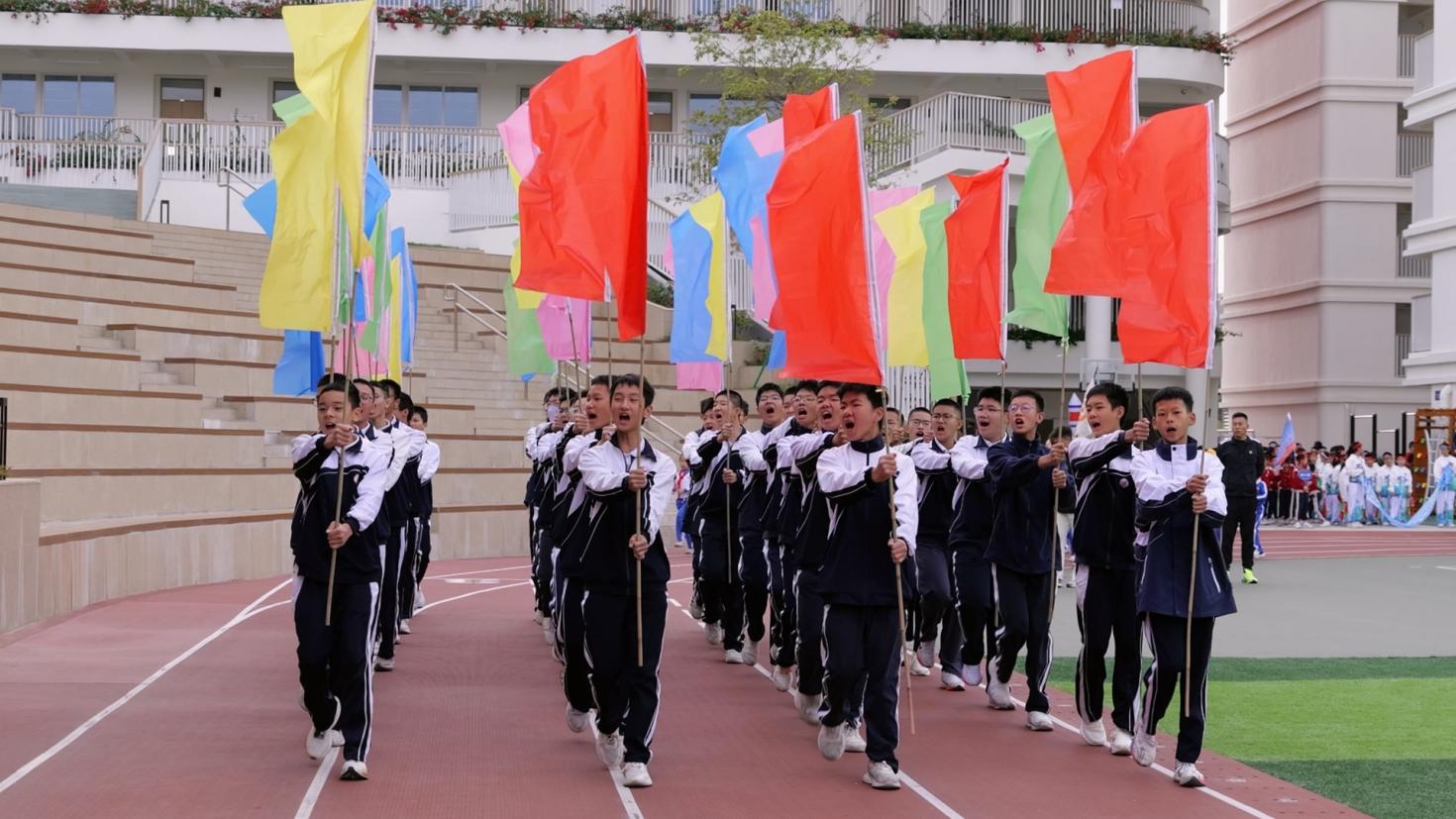 运动会开幕式上,《运动员进行曲》雄壮奏响,各方阵依次登场。国旗护卫队英姿飒爽,国旗在阳光下熠熠生辉;校徽方阵步履坚定,校训精神胸前闪耀;彩旗方阵朝气蓬勃,旗帜迎风招展;鲜花队手持繁花,口号嘹亮铿锵,为盛会注入满满活力。各班级方阵创意十足,小学部四(1)班的“火箭班”以航天服、渐变扇演绎“挑战自我” 的信念,五(2)班的“瓶子舞” 独具特色,以灵动姿态绽放别样风采;八(2)班学子手持巨型国旗奔入跑道,以“八二第一,中国第一”的呐喊告白祖国,尽显少年赤诚。